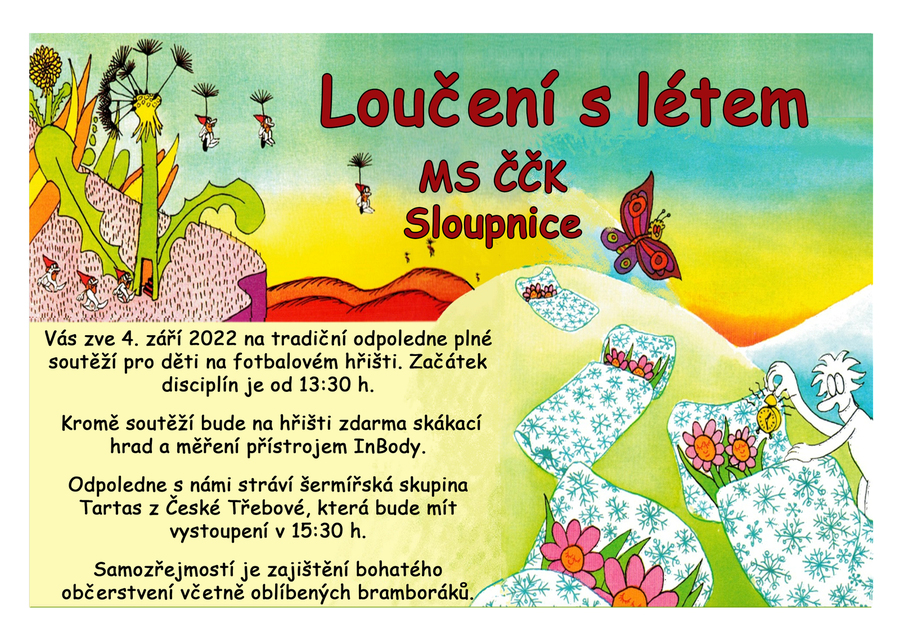 MS CČK Sloupnice Vás zve 4. září 2022 na tradiční odpoledne plné soutěží pro děti na fotbalovém hřišti. Začátek disciplín je od 13:30 h.